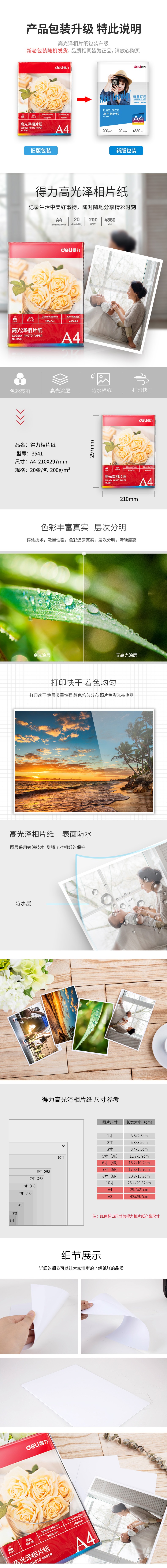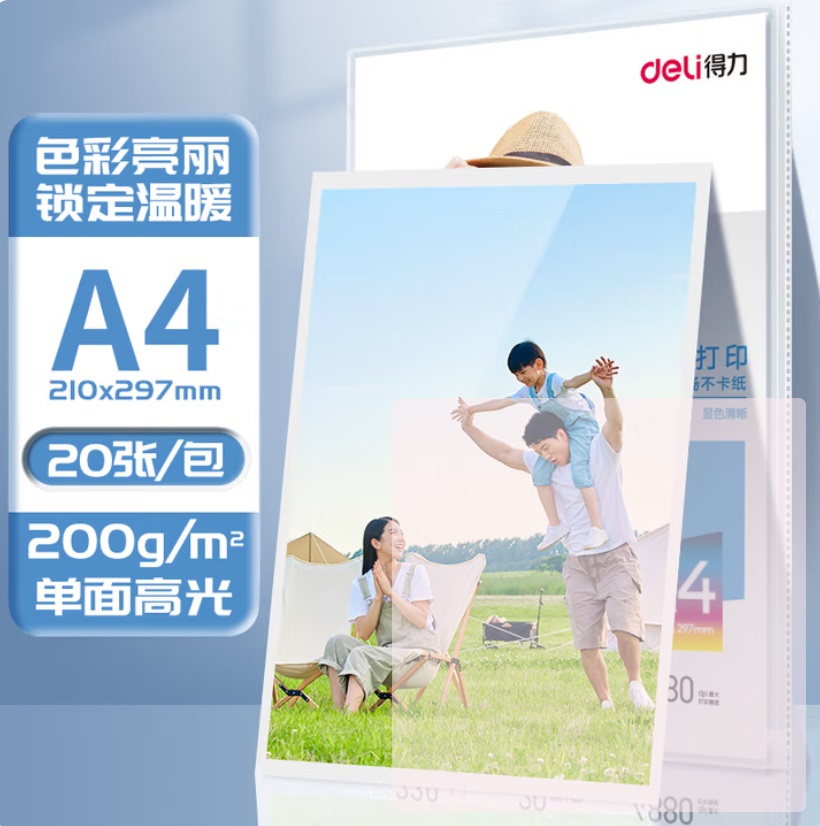 • 商品名称:得力 03541 高光 相片照片纸 A4 200g 20张装 210mm×297mm