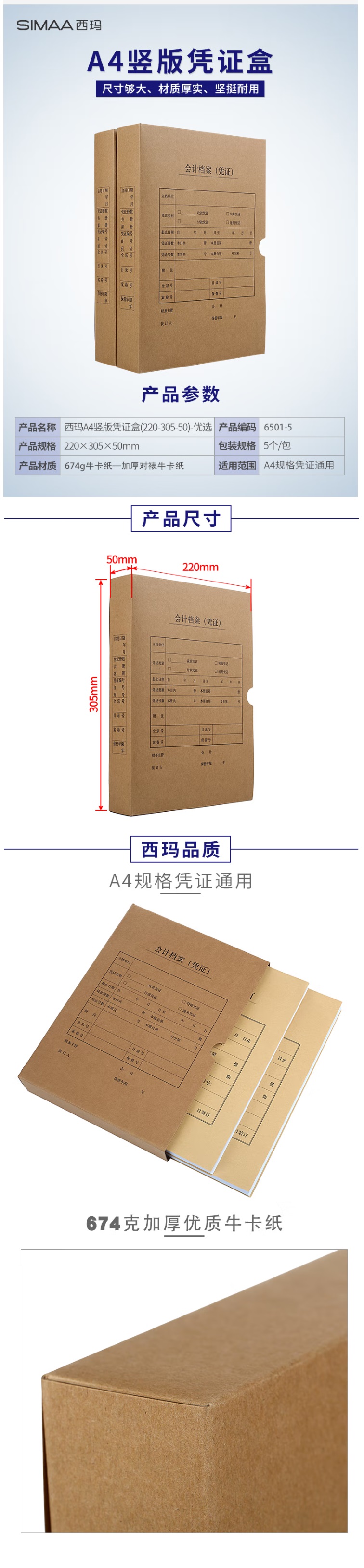 • 商品名称:西玛 6501 A4规格 竖版 凭证装订盒 单封口 674g牛卡纸