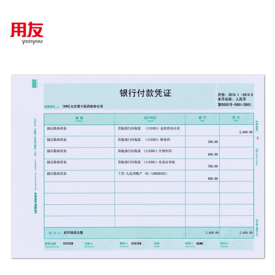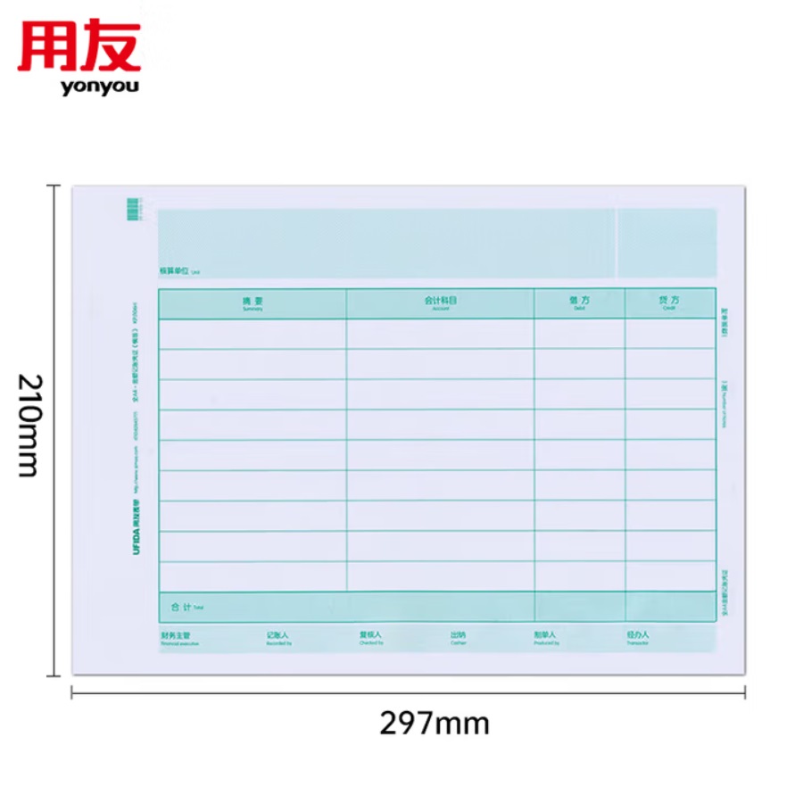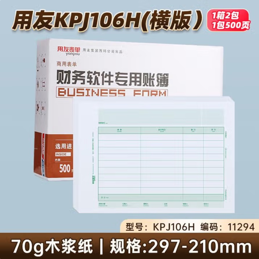 • 商品名称:用友KPJ106H用友凭证纸 金额记账凭证 A4横版 500张×2包