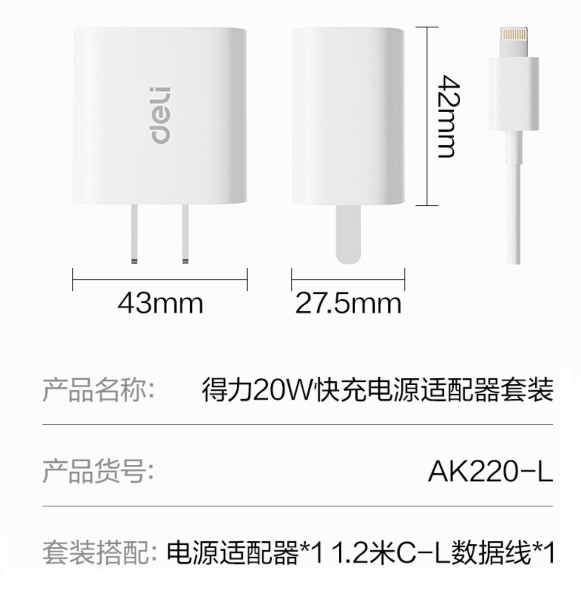 • 商品名称:得力 AK220-C 氮化镓快充 充电器套装 20W 含双Type-C数据线1.2米 华为小米安卓手机
