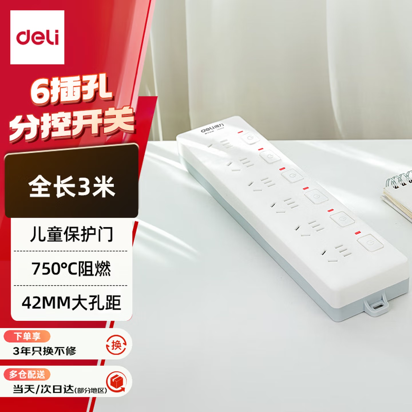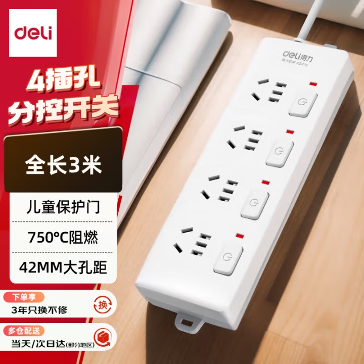 办公生活 插座 得力 3998 新国际 独控 单排插座 有线 线长3.0米 5三孔...