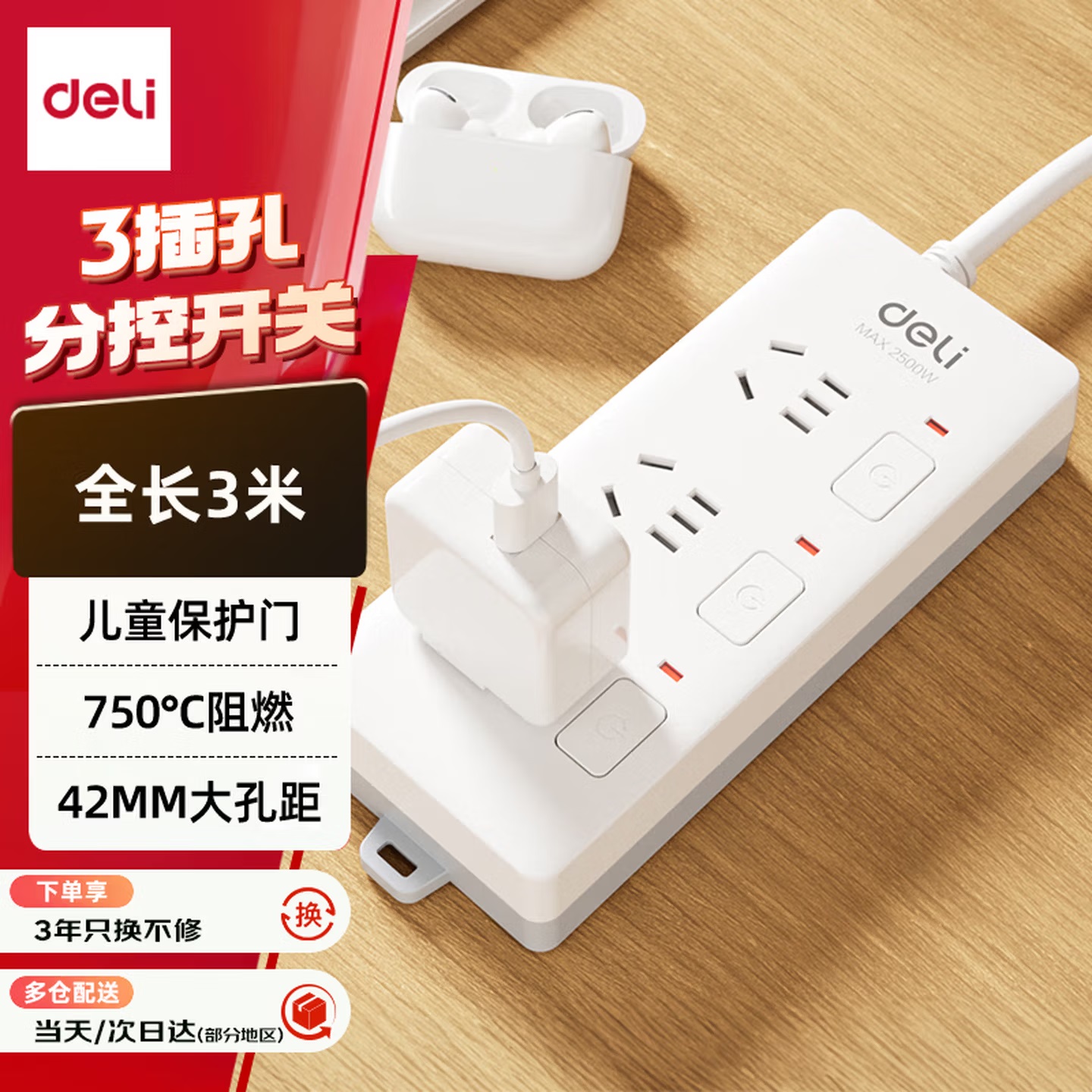 • 商品名称:得力 3998 新国际 独控 单排插座 有线 线长3.0米 5三孔