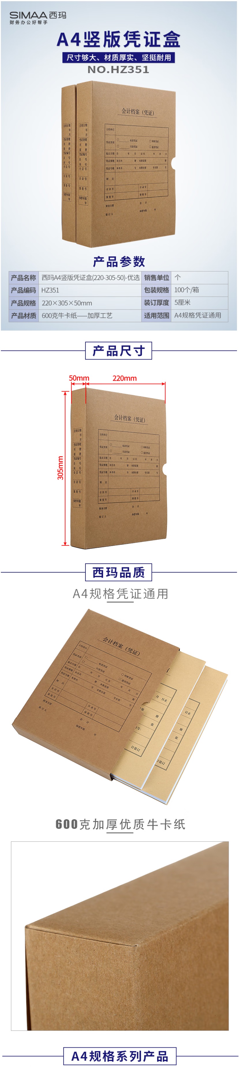 • 商品名称:西玛 HZ351 A4规格 竖版 凭证装订盒 单封口 600g牛卡纸