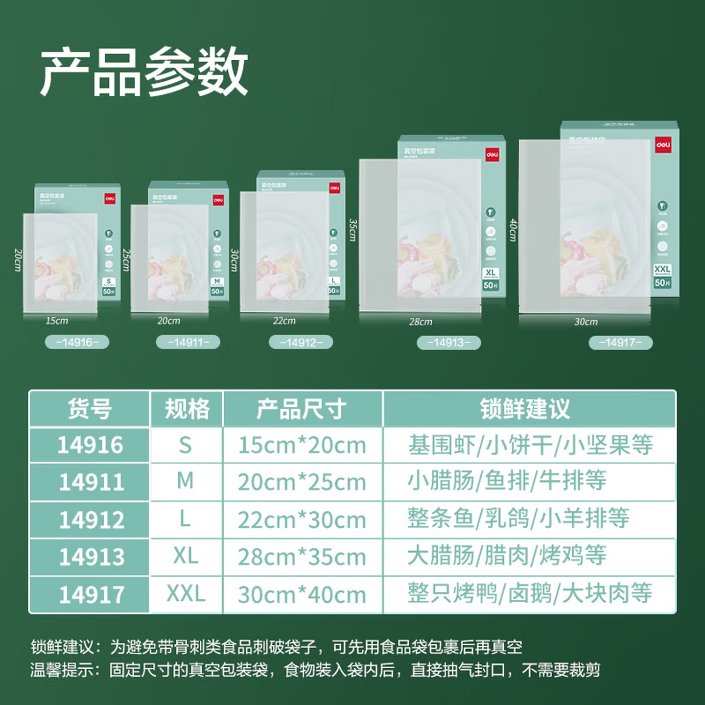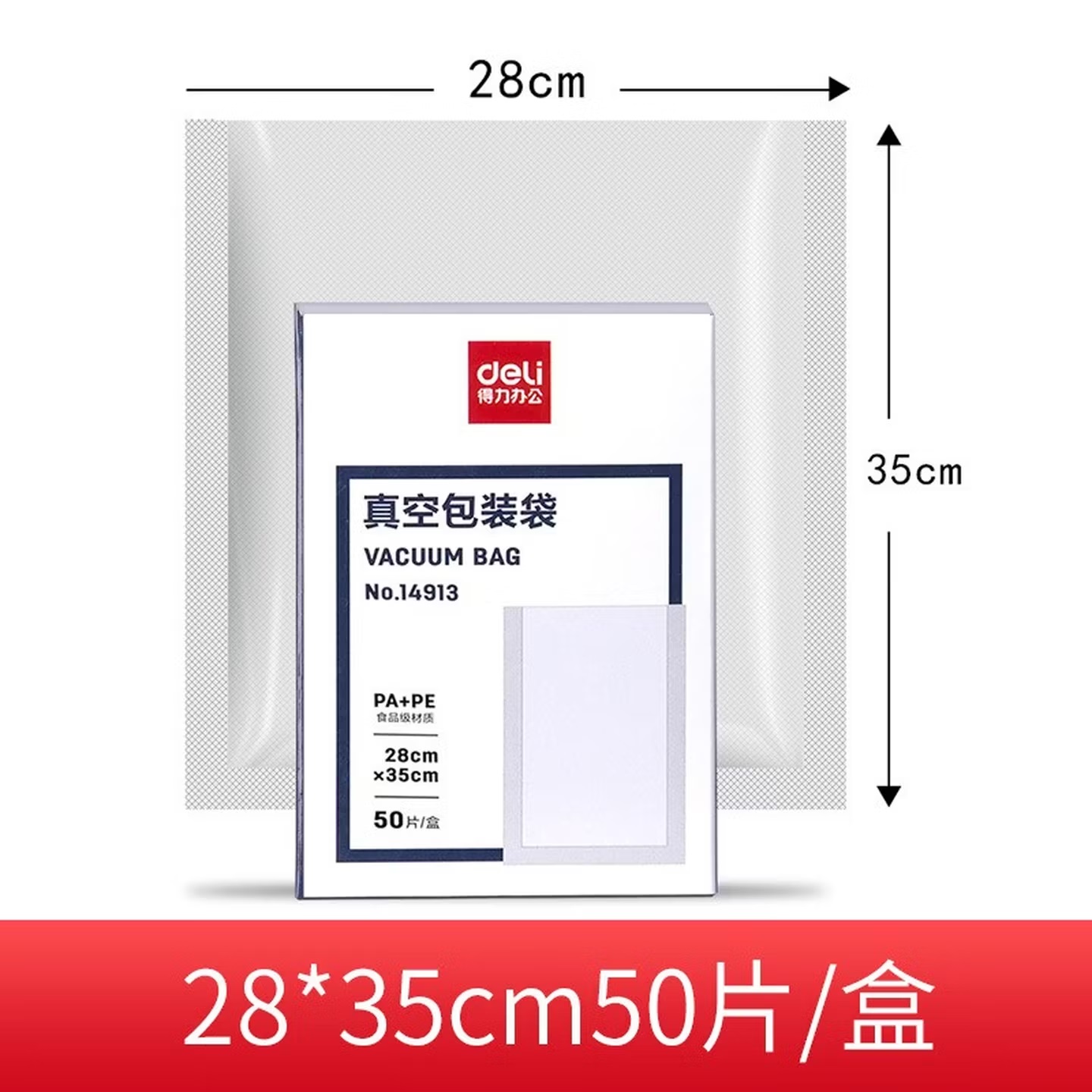 • 商品名称:得力14913食品级材质 双面压纹 透明真空包装袋 28mm×35mm×50片