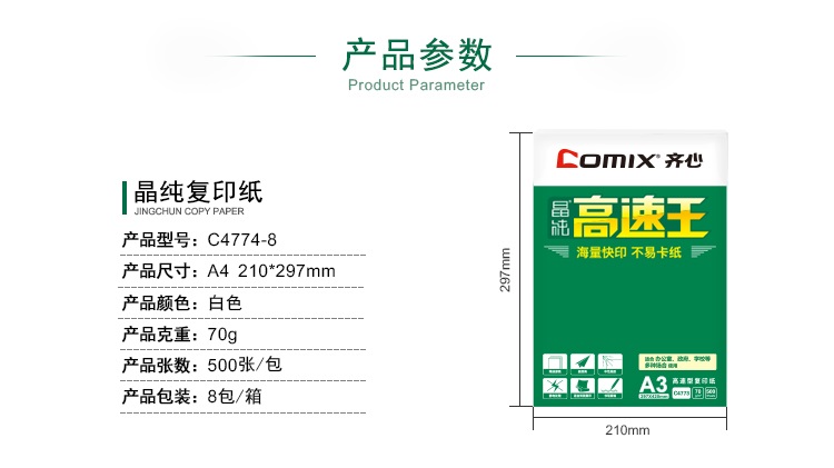 • 商品名称:晶纯 A4 高速王复印纸70g 500张×1包 单张尺寸 210mm×297mm