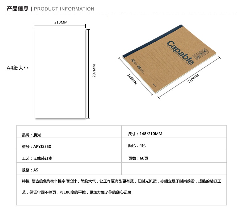 • 商品名称:晨光 APYJS550 牛皮封面无线装订本A5 60页 148mm×210mm