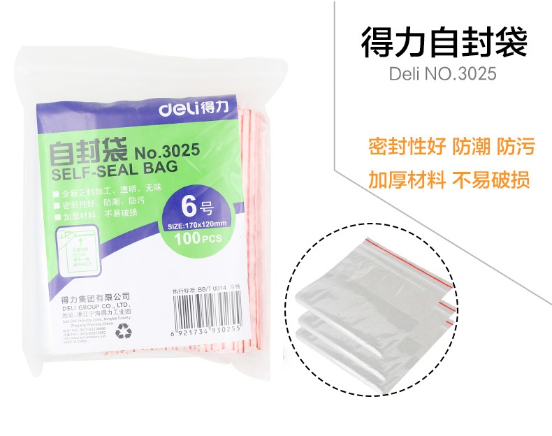 • 商品名称:得力 6号 加厚自封袋3025 100个装 170mm×120mm