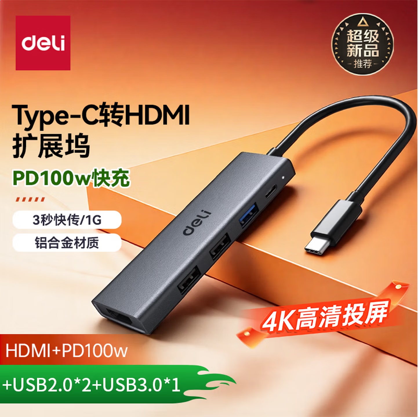 • 商品名称:得力 AK752 五合一 多功能高速扩展坞 Type-C转USB/HDMI