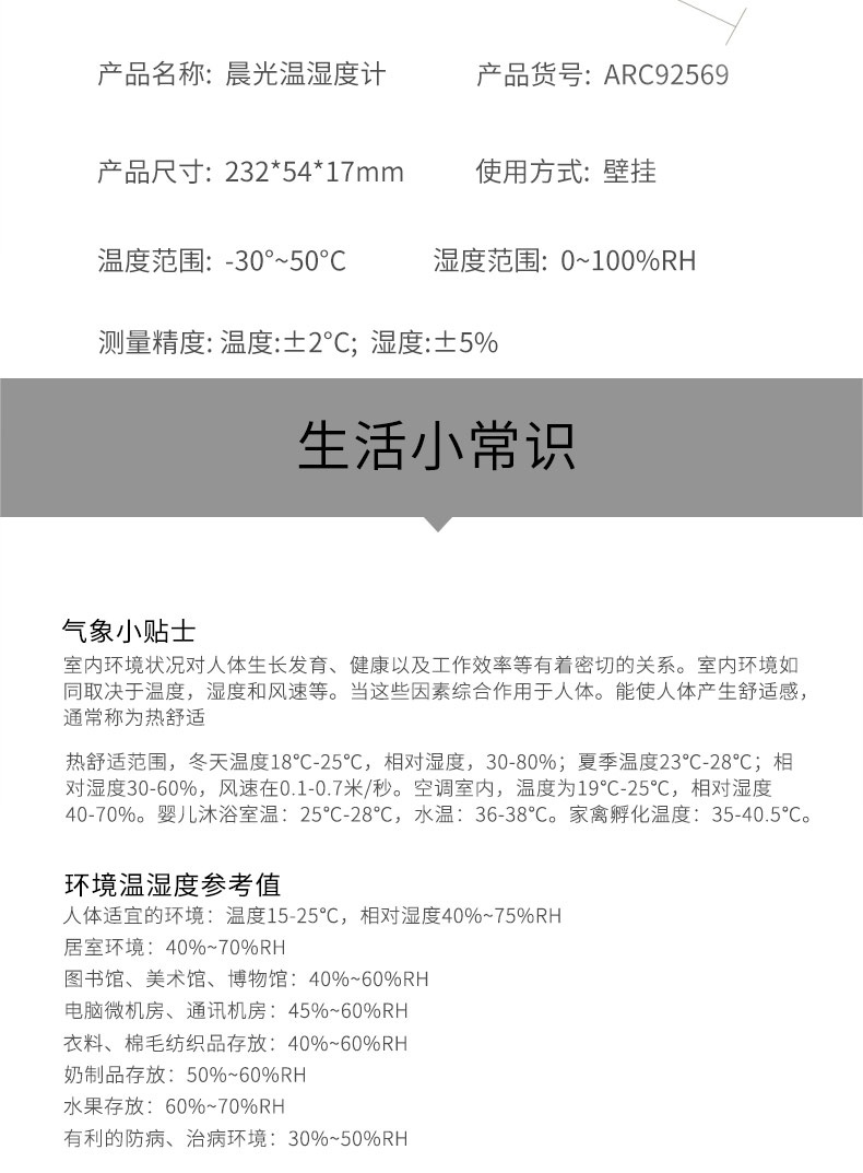 • 商品名称:晨光 A92569 高精度 壁挂式 温湿度计 54mm×232mm