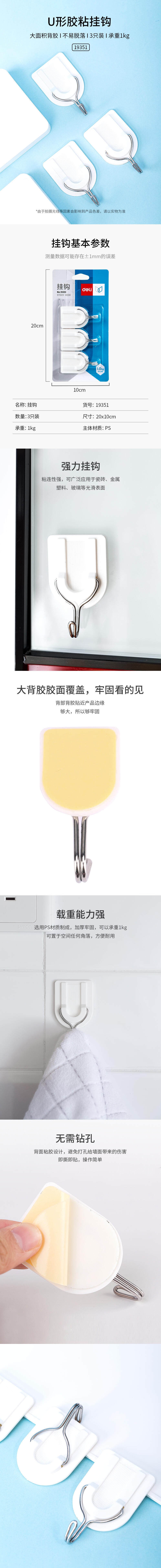 • 商品名称:得力 19351 U型背胶 强力粘钩 3只装 承重1kg