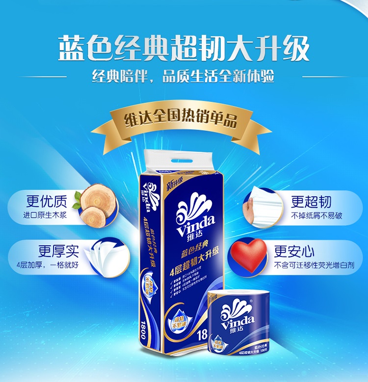 • 商品名称:维达 V4028 蓝色 经典 四层 卫生卷纸 180克×10卷