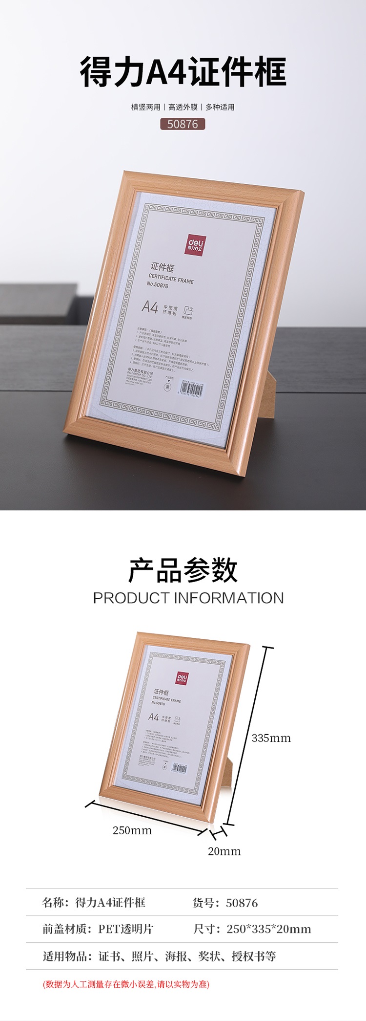 • 商品名称:得力 50876 营业执照框 相框 A4 挂立 335mm×250mm 榉木色
