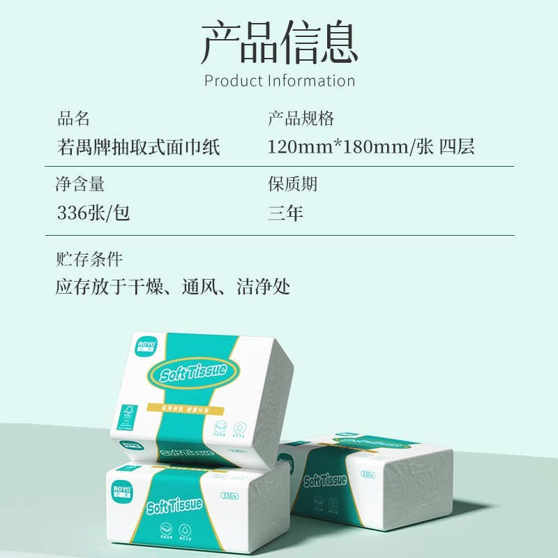 • 商品名称:若禺 R026 四层 软抽巾纸 全木浆 120mm×180mm 336张