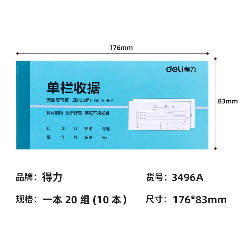 • 商品名称:得力 3496A 二联 单栏 无碳复写 收据 176mm×83mm 20组