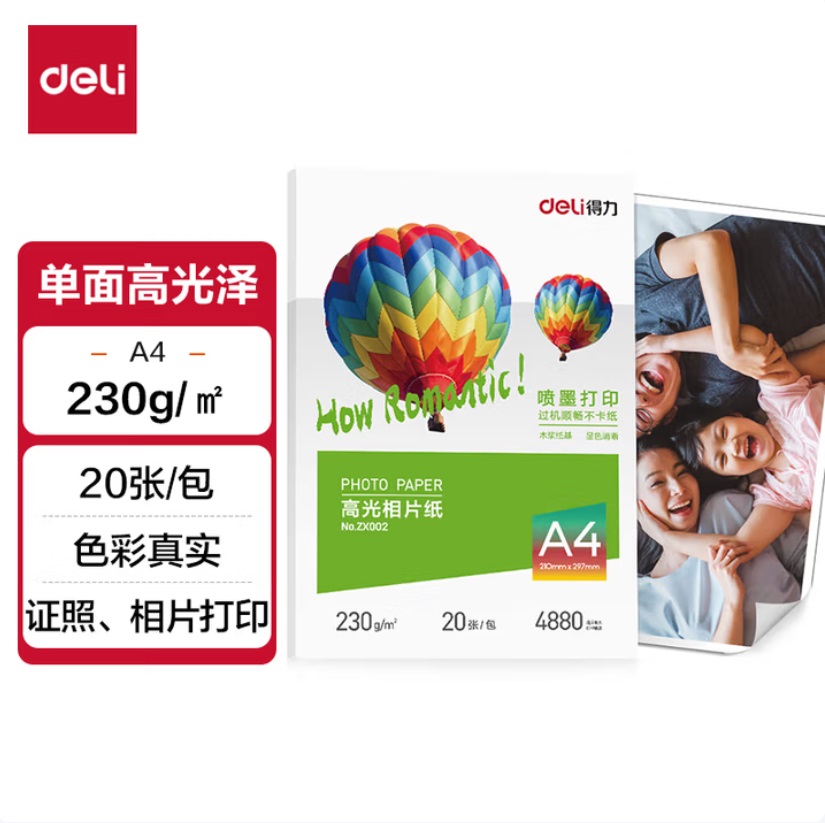 • 商品名称:得力 ZX002 高光 相片照片纸 A4 230g 20张装 210mm×297mm