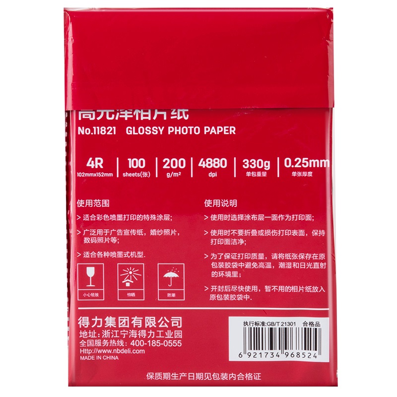 得力 ZX003 高光 相片照片纸 6英寸 230g 100张装 102mm×152mm