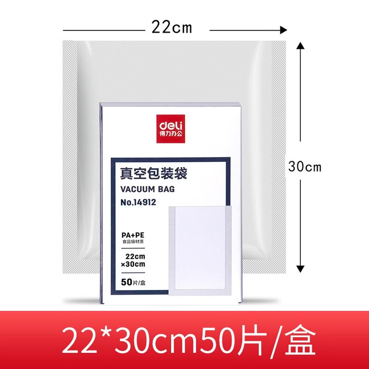 • 商品名称:得力14912食品级材质 双面压纹 透明真空包装袋 22mm×30mm×50片