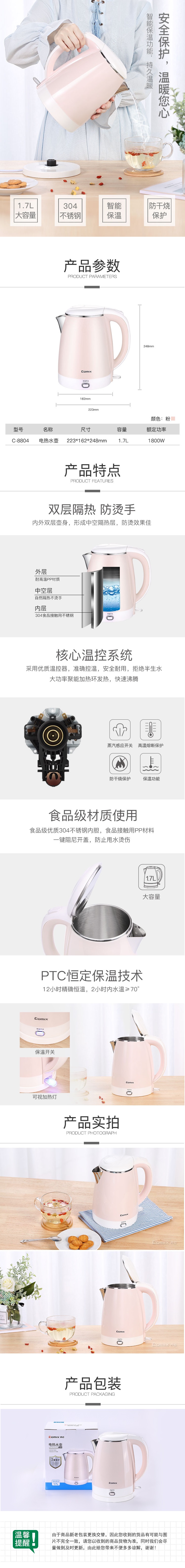 • 商品名称:齐心 C-8804 双层 全钢防烫 电热水壶 一键保温 粉色 1.7L