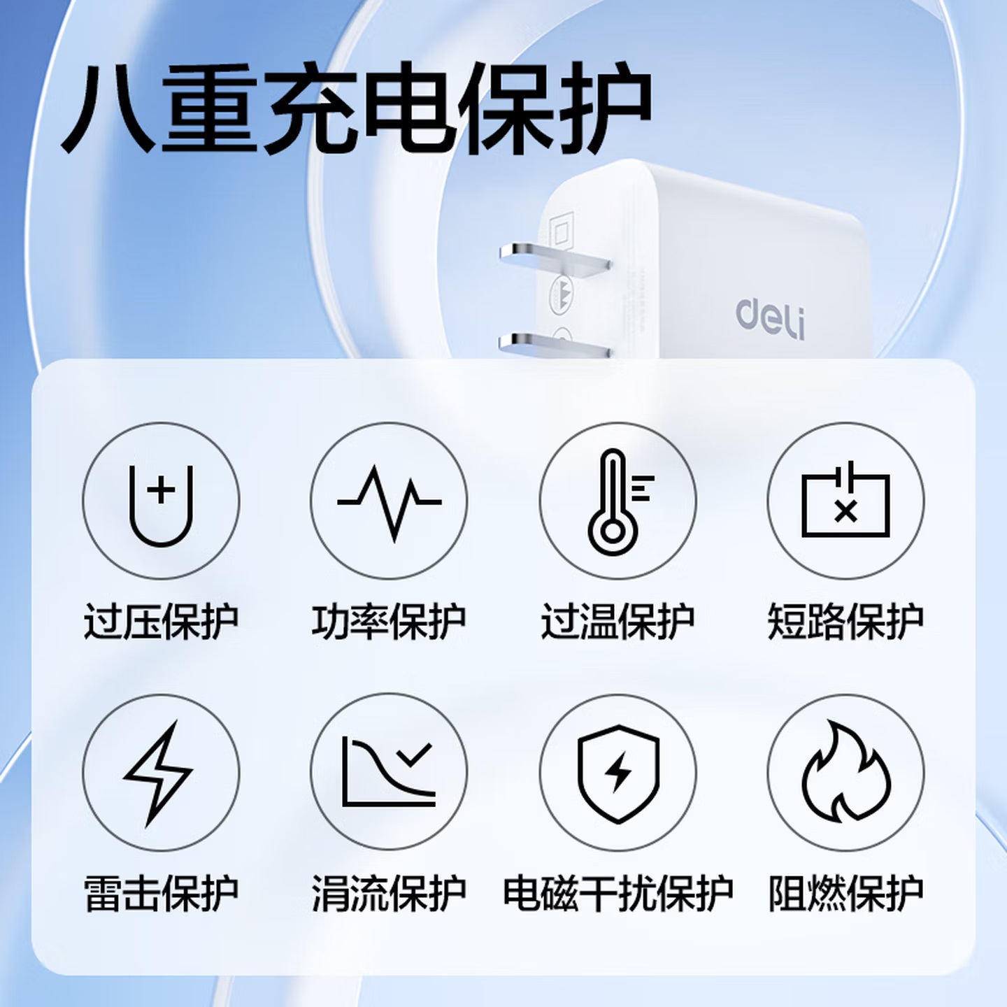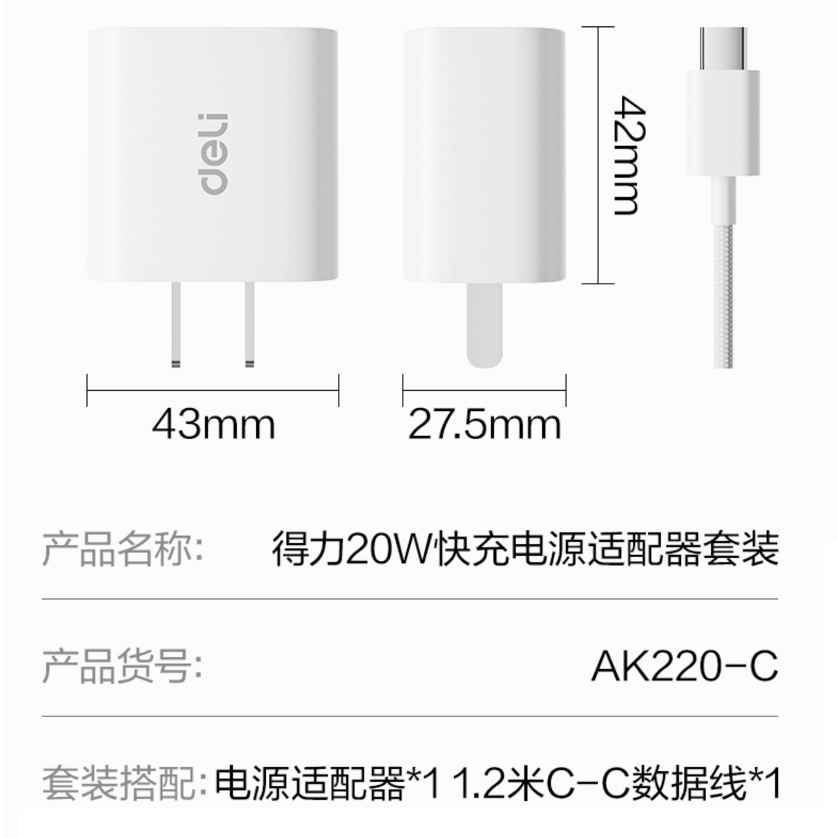 • 商品名称:得力 AK220-L 氮化镓快充 充电器套装 20W 含Lightning数据线1.2米 苹果iPhone8-14全系手机