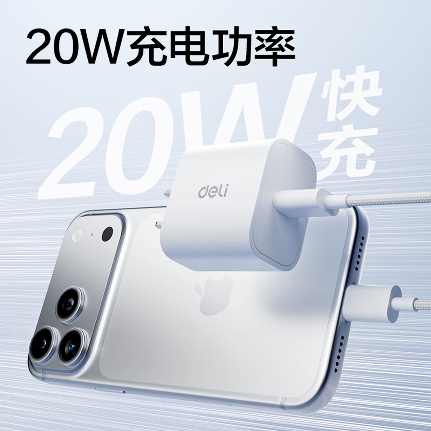 办公设备 数码线材 得力 AK220-L 氮化镓快充 充电器套装 20W 含Lightning数据线1.2米 苹果iPhone8-14全系手...