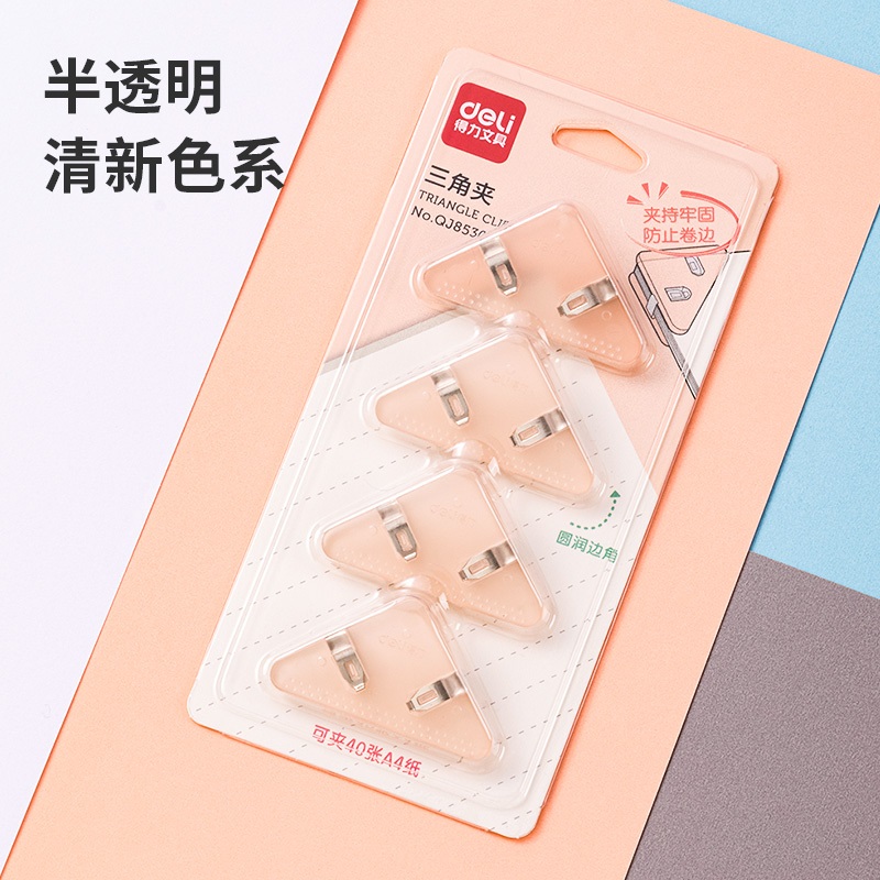 日常文具 票夹 得力 QJ8530 多功能 直角边角夹 透粉 4只装...
