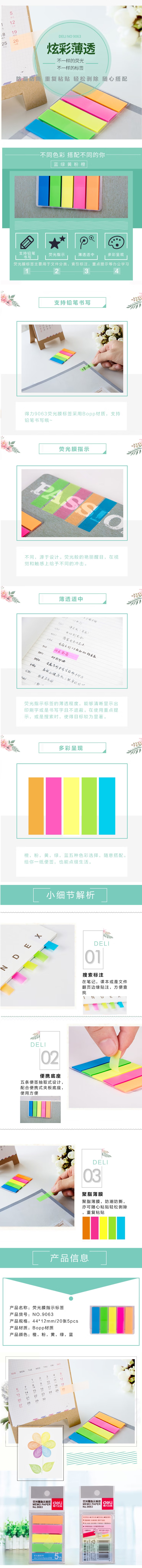 • 商品名称:得力 9063 夹挂式 荧光膜 索引指示贴 五色 100张 12mm×44mm