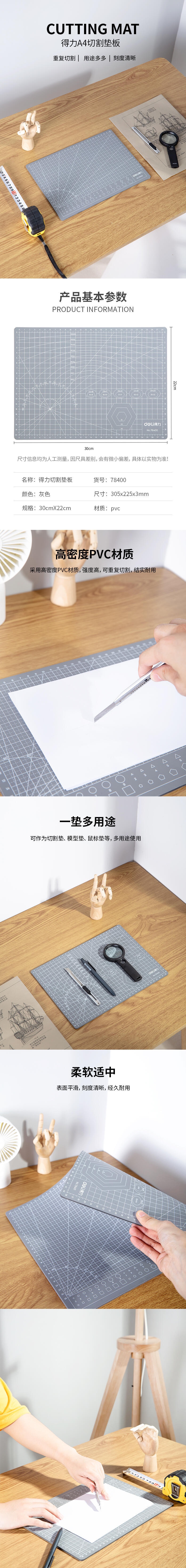 • 商品名称:得力 78400 耐用PVC 多用途 切割垫板 灰色 A4 305mm×225mm