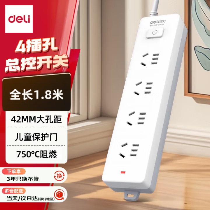 • 商品名称:得力18153 新国际 总控 单排插座 有线 线长1.8米 4三孔