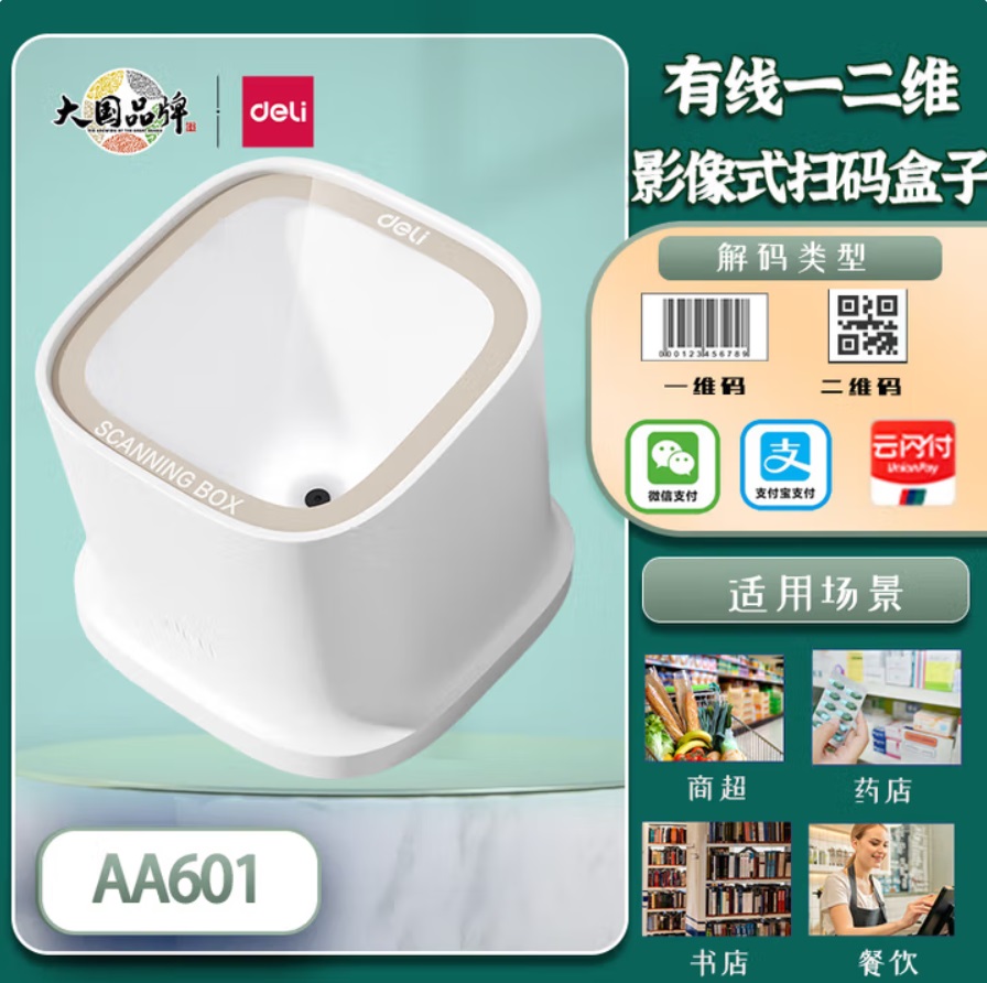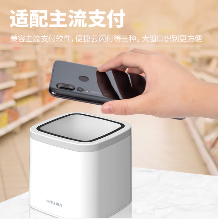 • 商品名称:得力AA601 超薄款 扫码收银平台 有线 一维码/二维码 银色