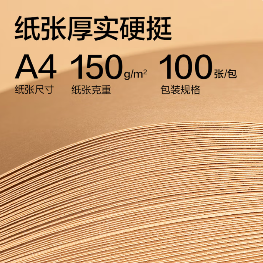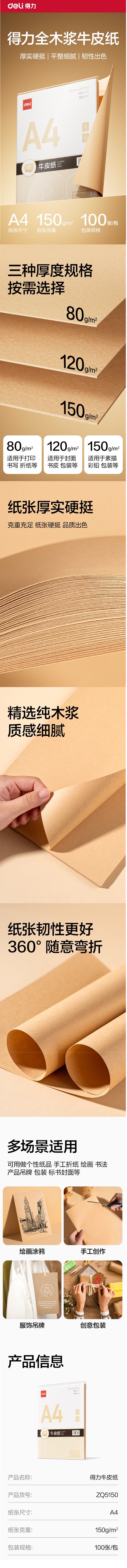 • 商品名称:得力 ZQ5150 加厚型 全木浆牛皮封面 A4 150g 100张