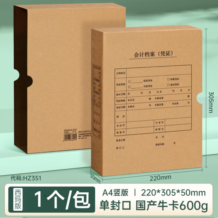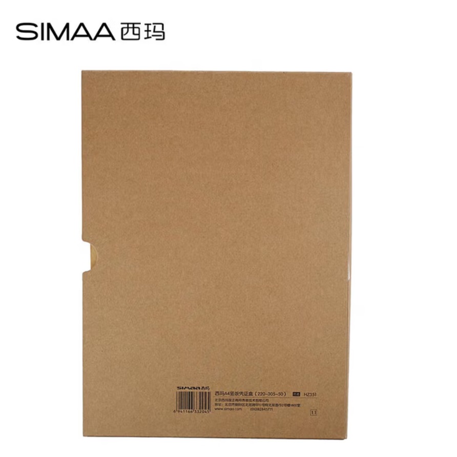 • 商品名称:西玛 HZ351 A4规格 竖版 凭证装订盒 单封口 600g牛卡纸