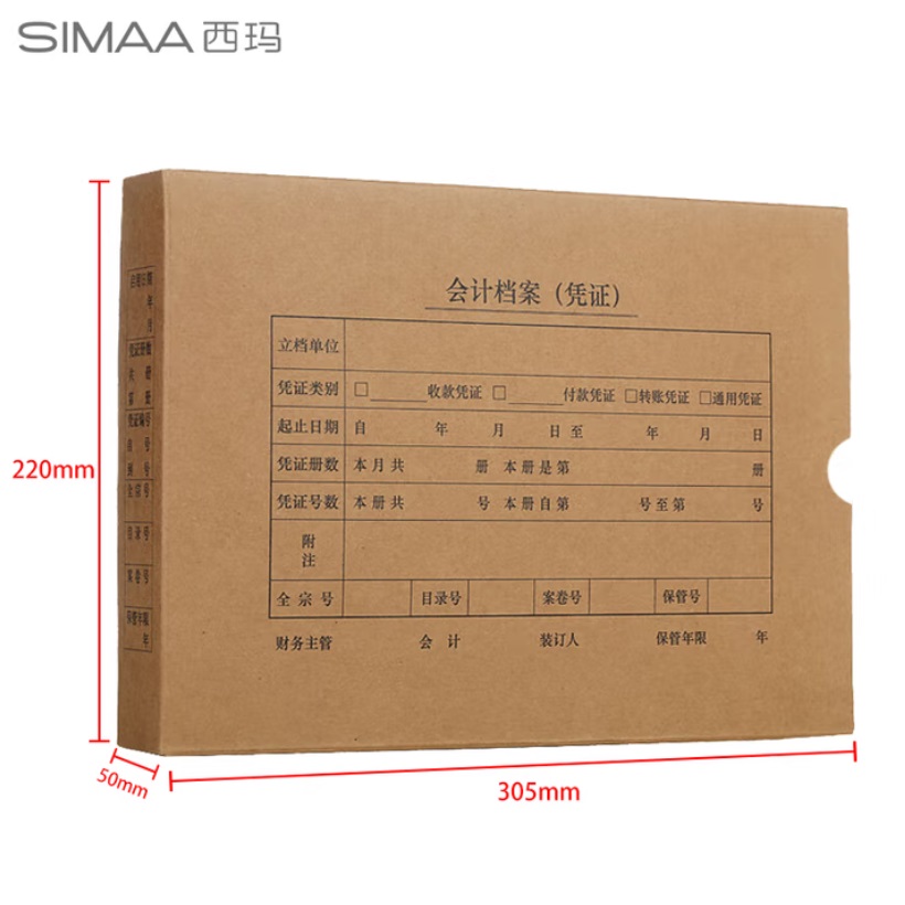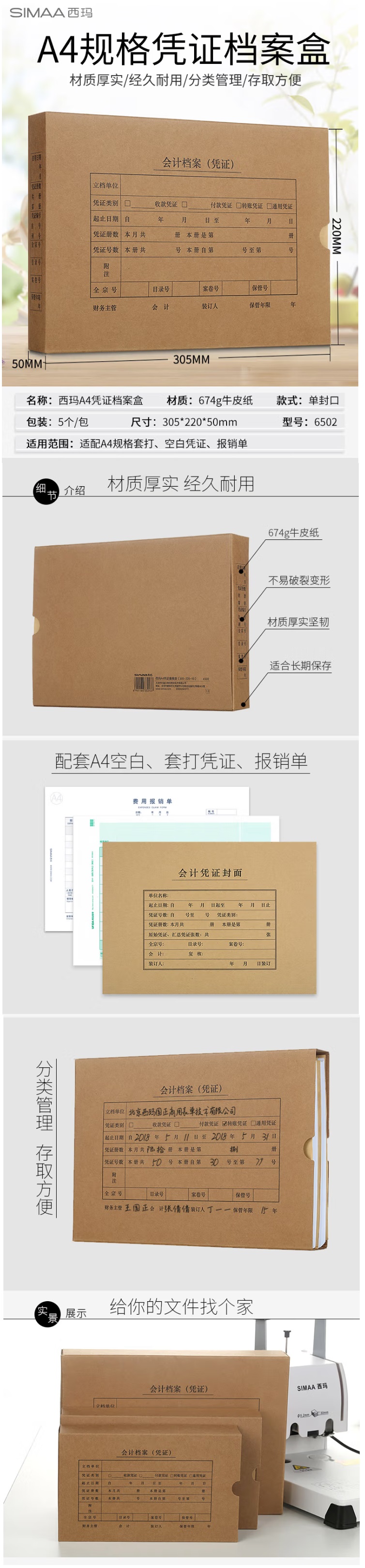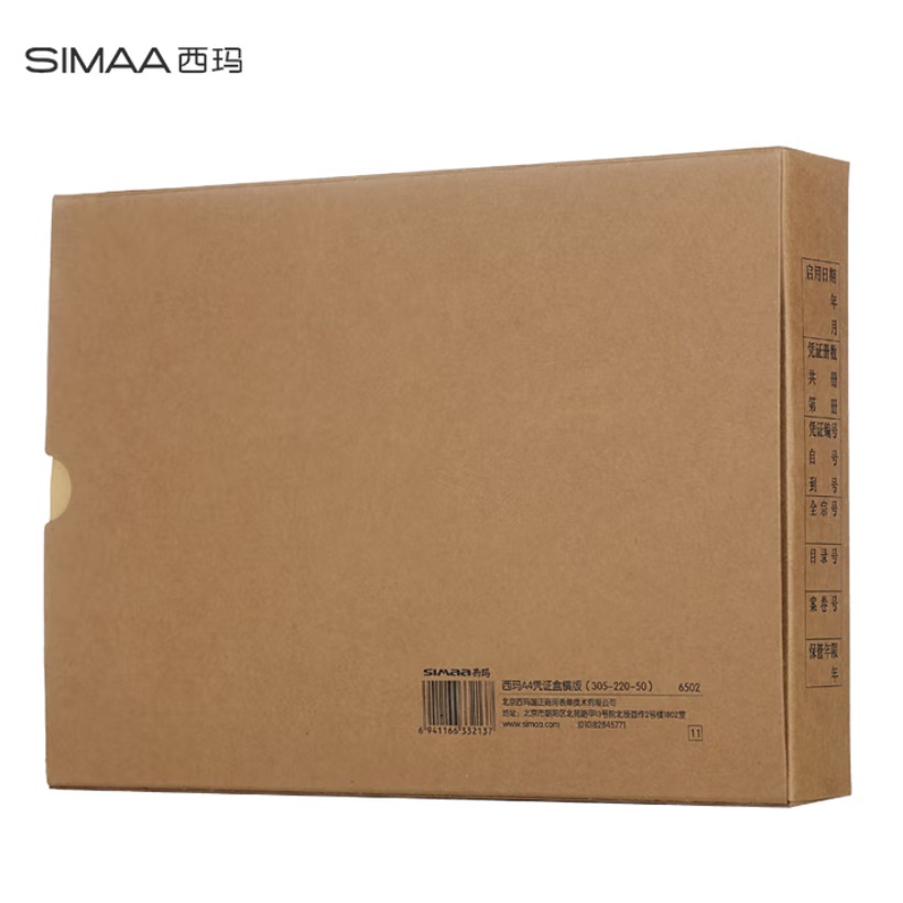• 商品名称:西玛 6502 A4规格 横版凭证装订盒 单封口 674g牛卡纸