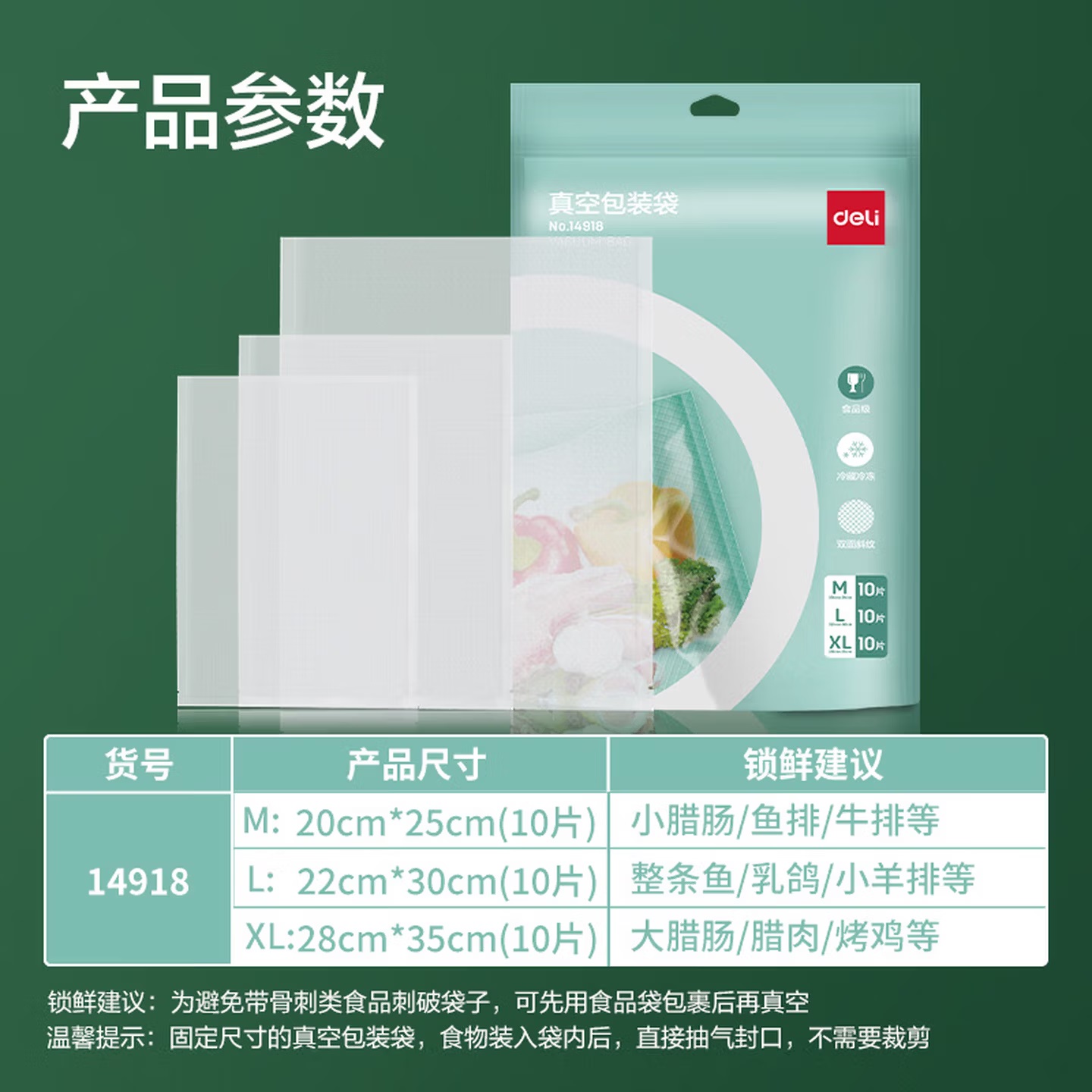 • 商品名称:得力14918食品级材质 双面压纹 透明真空包装袋 混合装共30片