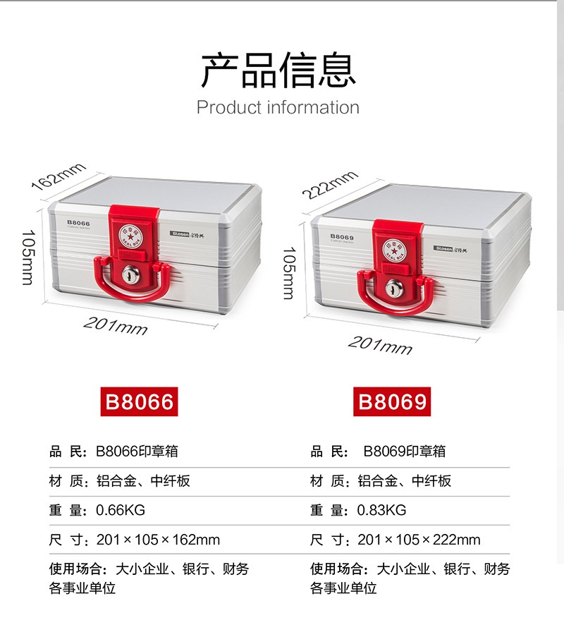 • 商品名称:金隆兴 B8066 带锁 铝合金 中号 印章箱 6格 长201mm×宽162mm×高105mm