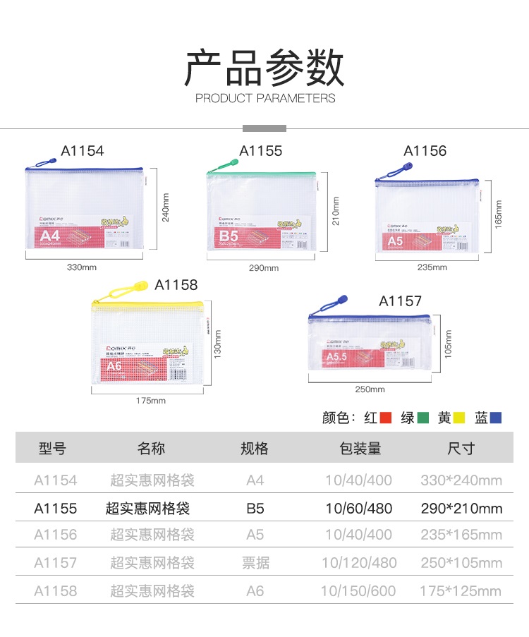 • 商品名称:齐心 A1155 方型网格 透明 拉链袋 B5 PVC材质 290×210mm
