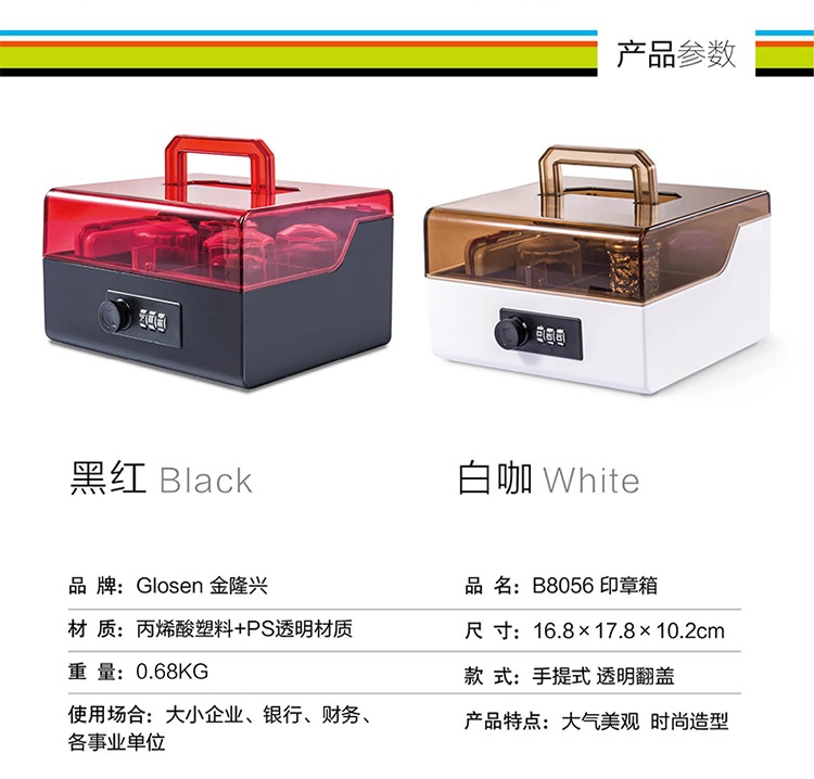 • 商品名称:金隆兴 B8056 黑红 密码锁 小号 印章箱 4格 长168mm×宽178mm×高102mm