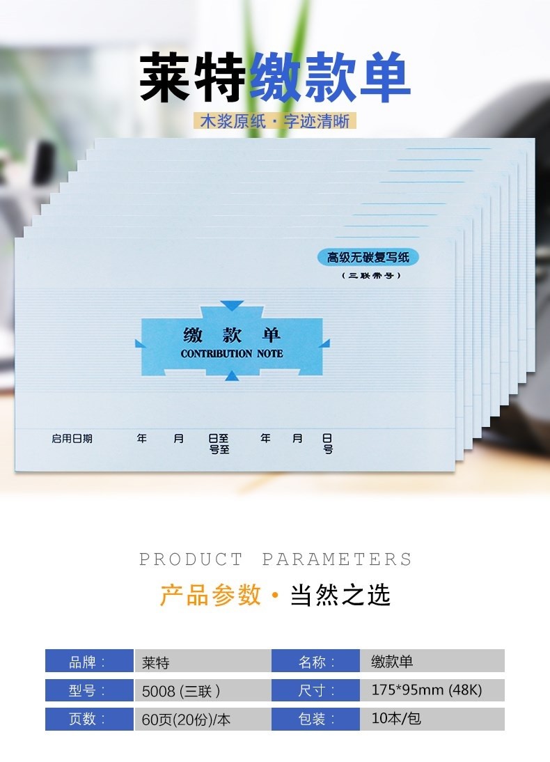 • 商品名称:莱特 48K 三联无碳复写缴款单 5008 173mm×95mm 20组