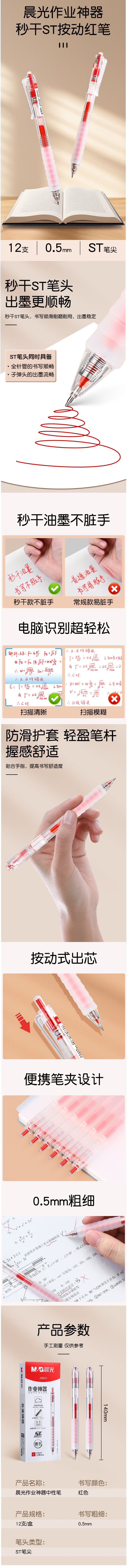 • 商品名称:晨光 AGPJ0601 按键式 硅胶软握 速干 中性笔 0.5mm 红色